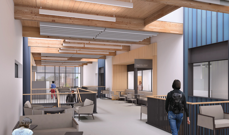 The building will house a full-service lab for cancer patients and will feature a private waiting area. The lab will provide same-day results for most tests. Waiting rooms and common spaces will be filled with sunlight and feature natural materials, clean lines and easy way-finding.